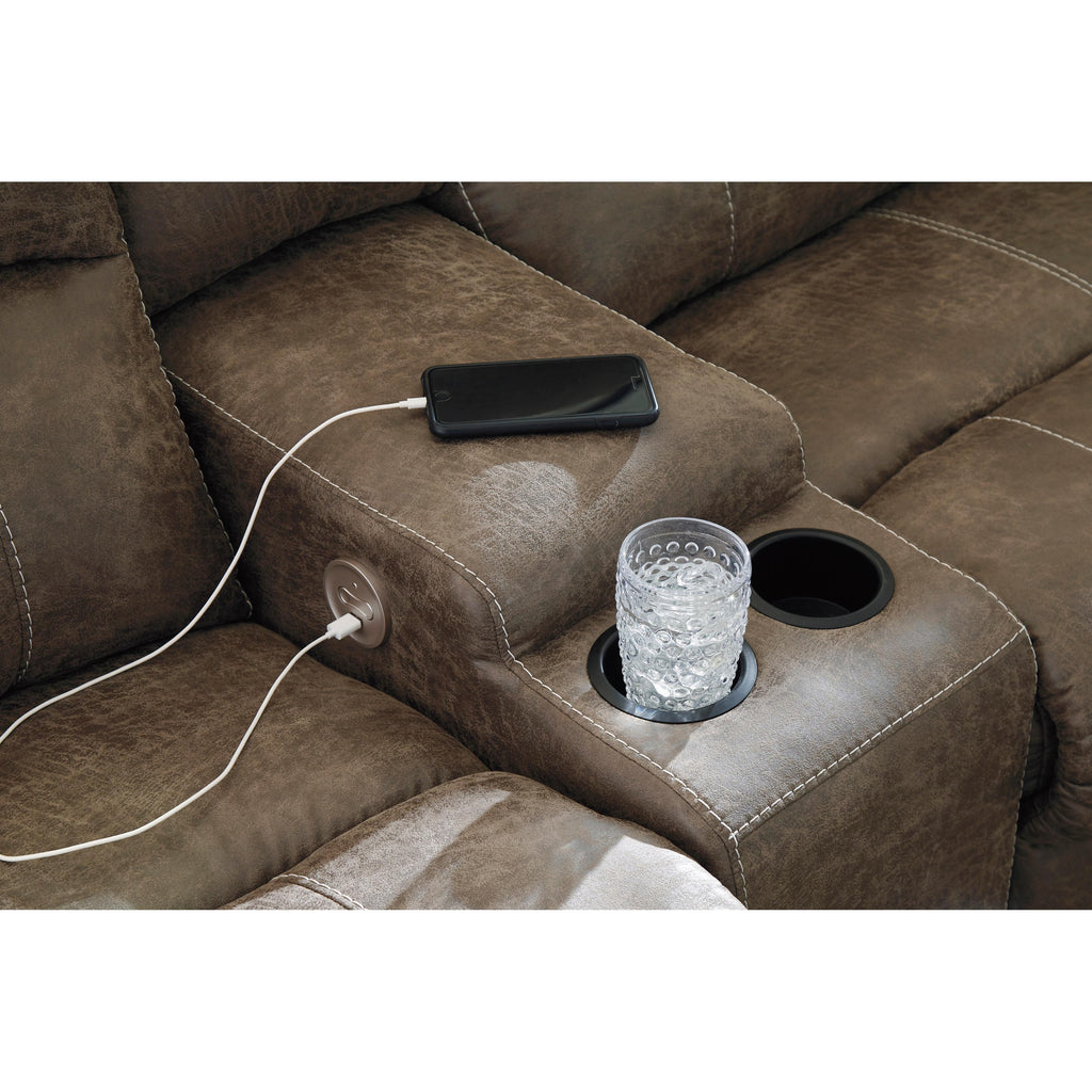 • USB charging ports and 2 cup holders in sofa's console