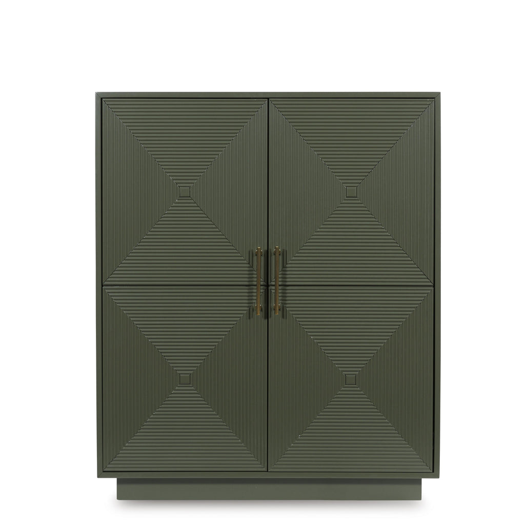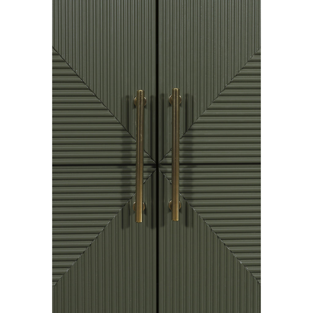 This accent cabinet makes a big impact with just one piece. Its intricately patterned doors impress with their dimension, while... This accent cabinet makes a big impact with just one piece. Its intricately patterned doors impress with their dimension, while the dark green finish and sleek goldtone handles add a touch of modern elegance. Adjustable shelves add everyday functionality to this sophisticated yet approachable piece. View more