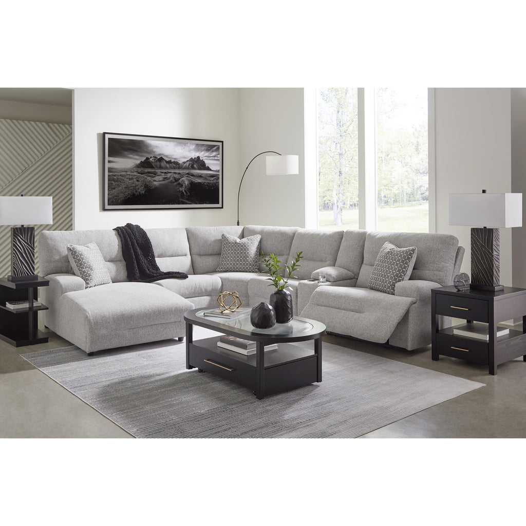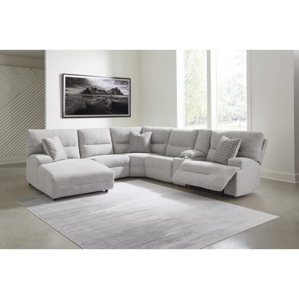 • Includes 6 modular pieces: left-arm facing power reclining back chaise, power armless recliner, armless chair, console with storage, wedge and right-arm facing power recliner
