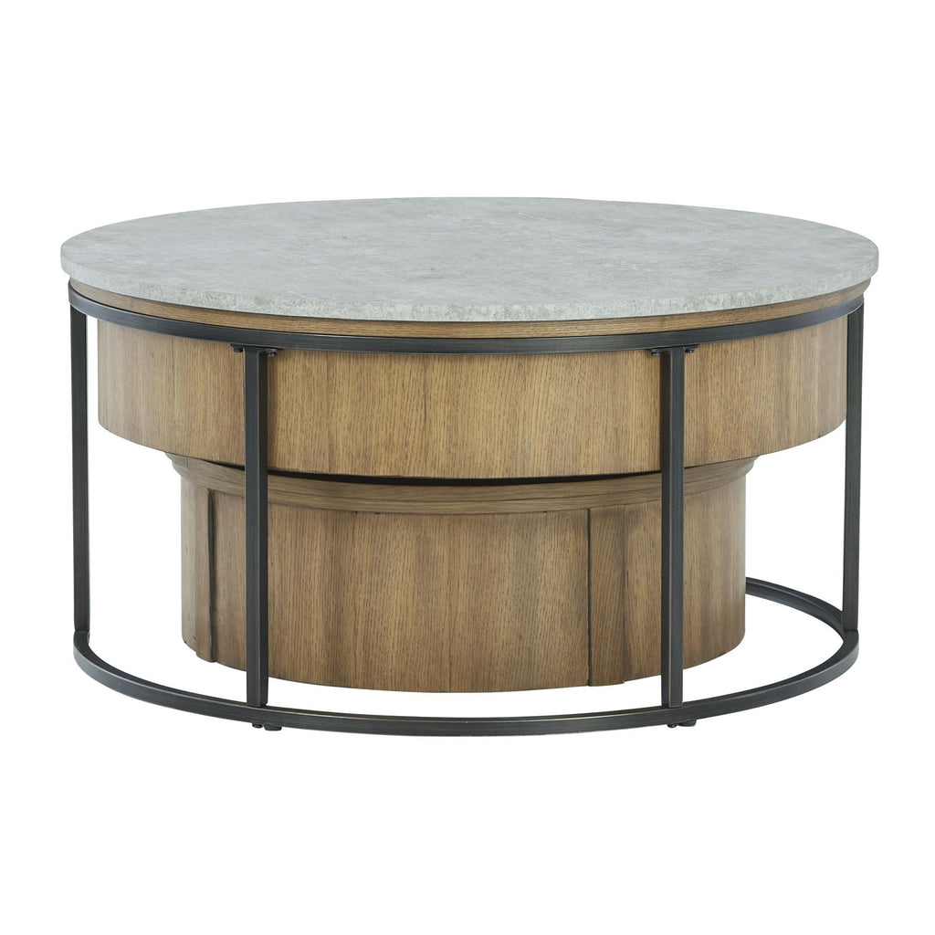 • Coffee table with faux cement melamine top; lift-top mechanism