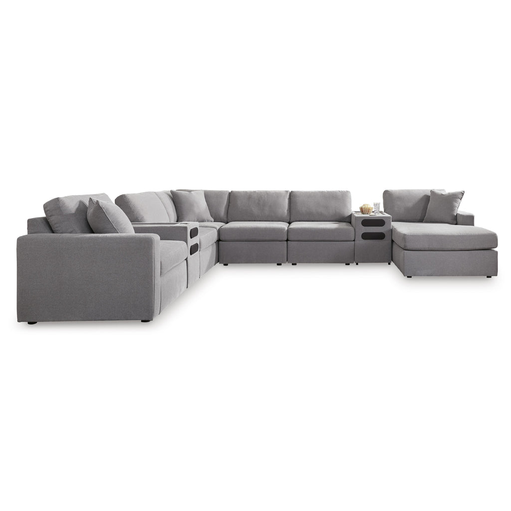 • Includes 8 modular pieces: left-arm facing corner chair, wedge, 3 armless chairs, 2 audio consoles with storage and right-arm facing corner chaise